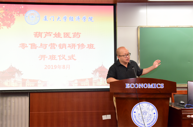 在开班仪式上,廖景峰主任首先代表厦门大学经济学院热烈欢迎尊龙医药零售与营销研修班的学员到厦大学习,并就厦门大学及经济学院的相关情况进行了介绍。他说,尊龙学员走进厦大就是厦大的校友,希望未来的日子能够关心、支持母校的发展,多提宝贵意见,同时他也祝大家在厦大学习期间学有所成、学有所获。